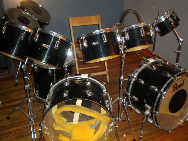 The Pearl set is fiberglass, 6 thru 16 concert toms, 16" floor tom, 2ea 22" bass drums virgins, all the stands for the toms, bass drum pedals, and comes with a slingerland highhat stand, and has original Pearl metal snare drum. Needs new drum heads. I can ship this, it is lightweight because of the fiberglass - Buyer pays all shipping costs - I'm firm on the price = $500 plus shipping - or you can pick up. I want this sold by friday so that i can pick up this roland before it sells. If you have a nice electronic kit to trade, hit me up.