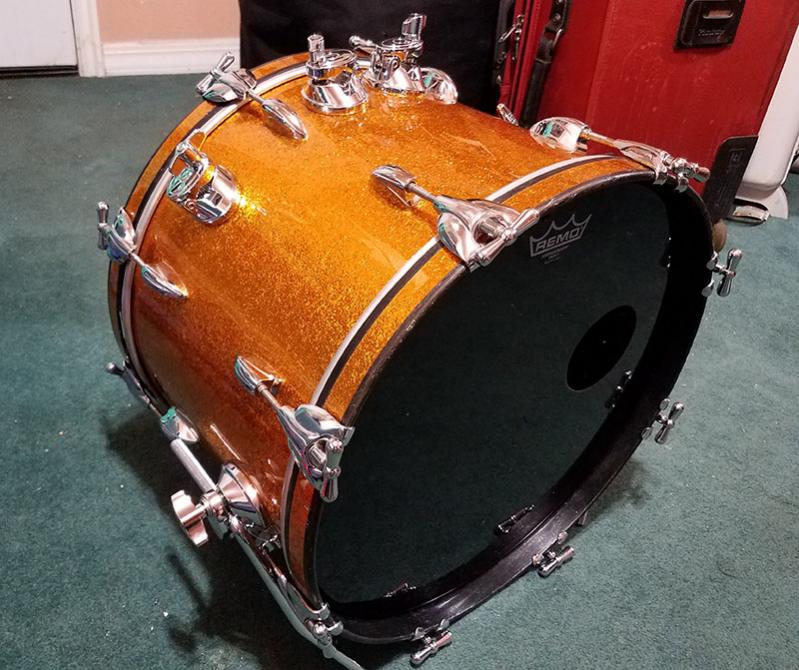 I'm going to stick my neck out and share an unusual, for me, experience with an orphan drum. A couple of years ago I acquired an old beat-up 1940's Slingerland 17-inch parade drum. It was in pretty bad shape, and the lugs were mostly cracked and broken. But the shell was in good condition, and it had wood hoops. I'd heard that there was a drummer in LA that liked 17-inch bass drums, so I cleaned up this old parade drum, and wrapped it with gold sparkle, special ordered some 17-inch heads, paired it with an old Rogers Swiv-O-Matic height adjustable kick pedal, and Voila a wonderful Bebop bass drum. I think it is perfect for intimate Jazz gigs. I wonder if anyone else has experienced a 17-inch bass drum.