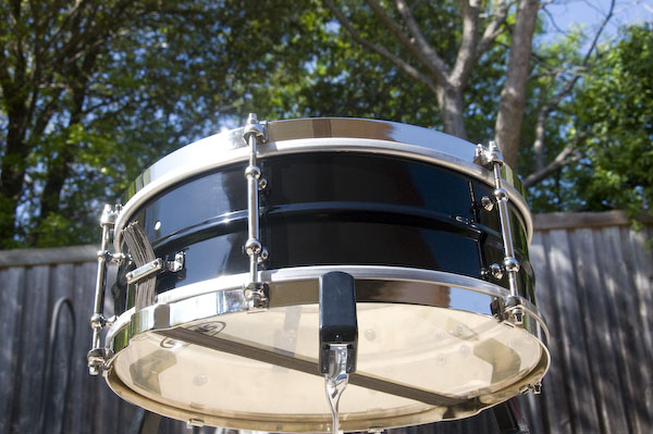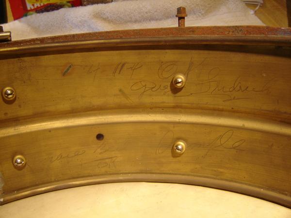 Hi All... I have a vintage snare drum that I cannot identify and I was wondering if anyone could help me out. It's a 5x14, 8 lug and on the inside is a handwritten date that says "4-11-4" and it is signed as ok by somebody (First name unknown) Last name is "Fredrick". The first name is hard to make out, it might be "Gus" but, I not sure. It also has written on the inside under the date "snare bed ok" and the word "Sample".