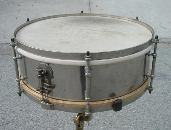 The drums were in very good shape given the fact that they are pushing 100, (we should all hope to look this good at 100 yrs. old!). I used Simple Green to clean the years of schmutz that accumulated on the shells and hardware. All of you know that I constantly preach: "rust does not sleep"...so any rust was handled by my trusty Dremel tool, soft steel brushes and 0000 steel wool (note to the Purists: don't get your undies in a bunch, no damage was done to the hardware with the 0000 steel wool). The 4x14 came to me missing the top rim so I had to have one fabricated. My machinist Abe Abello came through once again, notice how he nailed the "ears". If I hadn't pointed this out to you the top rim would have passed easily, that's how good Abe is! A thanks also goes to Les and Brian at Avenue Plating for the nickel plating.