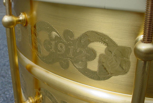 I knew about this a little over 2 years ago so when it officially became a part # in the Ludwig catalog Don Frank at Gelb Music (where I teach) placed the order. As you probably already know, each drum is serial numbered with a year of Ludwig's production (1909-2009); #1909 was supposedly set aside for the Ludwig Company so #s 1910-2009 were available to the public. I'm happy with #1912 (3rd one offered to the public) as 1912 signifies the very early years of L&L snare drum production. For a non-Ludwig endorser (me) this is a very low number. I think that Adrian Kirchler (AK Drums, Italy) nailed it on this drum. This guy is the real deal and a true artisan. Here's a few cool facts about this drum. The engraving pattern is the same as my 5x15 Super-Ludwig Triumphal on pgs. 16-17 in my book. Modern Drummer had an ad about 3 issues ago that stated that you could request that your name or initials be engraved on the top rim. This turned out to not be true as MD mistakenly printed the add or Ludwig didn't pull the ad in time, something happened. Consequently, from what I am told by AK is that there are only 3 orders that have the top rim engraved with the owner's names, my drum was one of them. I asked AK if he could engrave the lugs in the same style of the lugs on the original Triumphals and he did a very cool thing; he did engrave the lugs of the Triumphals but only for owners of original Triumphals so of the 100 anniversary snare drums only 3 have engraved lugs. The only thing that I would have liked to have seen was a nice Ludwig 100th Anniversary logo on the batter/snare side heads; notice how AK was able to spray the aluminum rims of the Evans heads to make them look like the flesh hoop of a calf head. In honor of Ludwig's 100th year anniversary I included a photo of a very early (1911-12) 6.5x14 Ludwig & Ludwig snare drum. Enjoy.