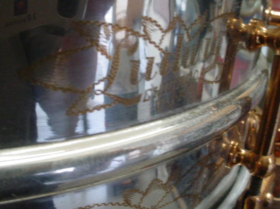 I think that this drum could have possibly been an un-cataloged special order. Everything points to a mid-1920s L & L DeLuxe snare drum (black nickel plating, 12 pt. floral engraving and DeLuxe copper plated/gold lacquered hardware) with the exception that the shell is nickel plated with the 12 pt. floral engraving showing through. I chose to leave the hardware as-is on this one. I also left the modern day heads on the drum as I liked the aesthetics of this. Not much more to say here so enjoy the photos. As always, I look forward to your comments.