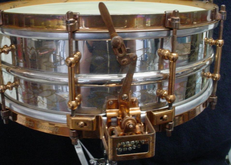 Here’s another one that I have had since the early days of my collecting but have never done an article on. You can see this drum on pages 86-87 in my book: VINTAGE SNARE DRUMS THE CUROTTO COLLECTION. I got this drum from The Starving Musician in Santa Clara, CA. Early on in my snare drum collecting and before EBay I developed a great relationship with Dave Lovvorn, long time manager of the Santa Clara Starving Musician store. These were great times, I would pull up in my van with a butt-load of drums and parts and Dave would open the store early so we could get started with our horse trading. From time to time Dave would allow me to buy a snare drum from their “top shelf”. In this case I remember that this drum was a birthday/Xmas present to myself. Great times from years past.