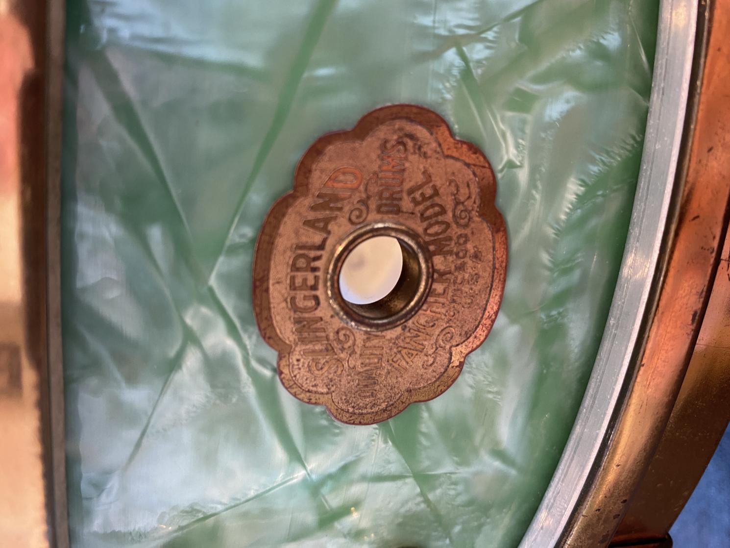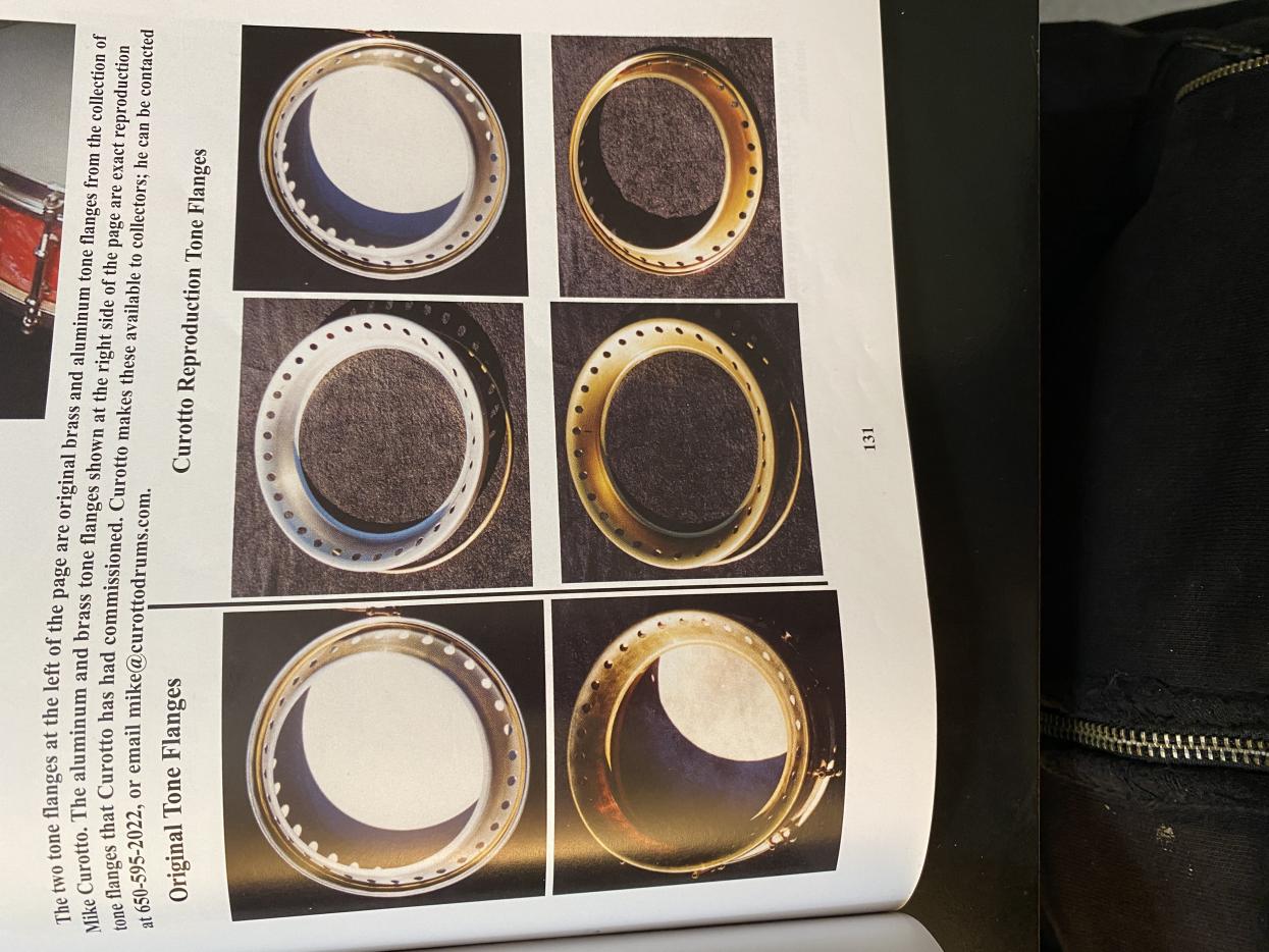 On page 131 of Rob Cook’s SLINGERLAND BOOK (see photo) you will see some Tone Flanges and the TFs that I have reproduced. So far I have come across three variations of TFs: 1. Solid brass 2. Solid brass with holes 3. Aluminum with holes. My good friend and fellow collector Joe Luoma astutely pointed out the idea -- as a possible cost-cutting factor -- the earliest sold brass TFs were followed by the TFs with holes and finally the aluminum TFs with holes…less weight = less expense. Makes sense to me.