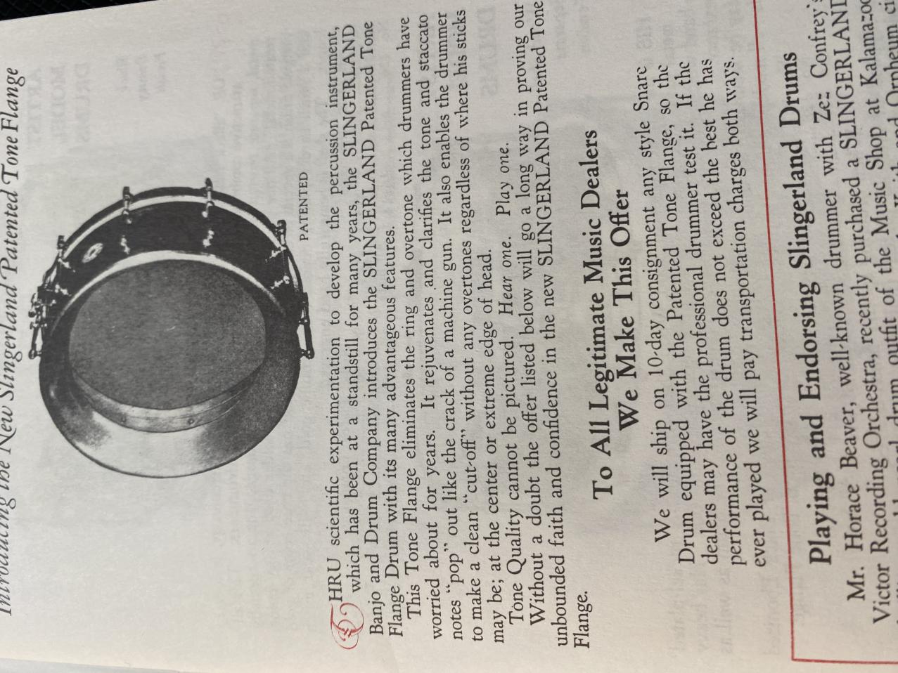 On page 7 of the 1928 Slingerland catalog (see photo) there is a paragraph that introduces “The SLINGERLAND Patented Tone Flange drum…”