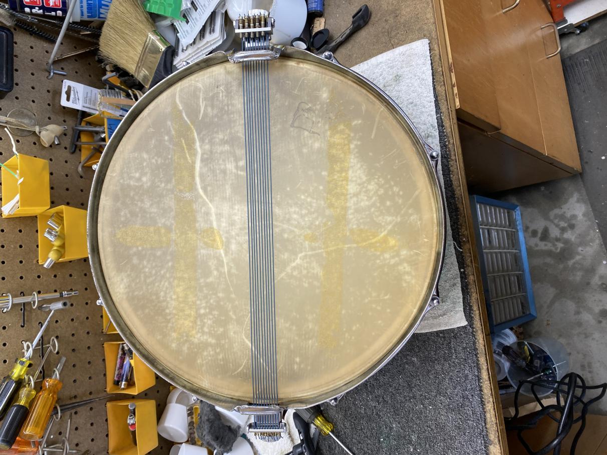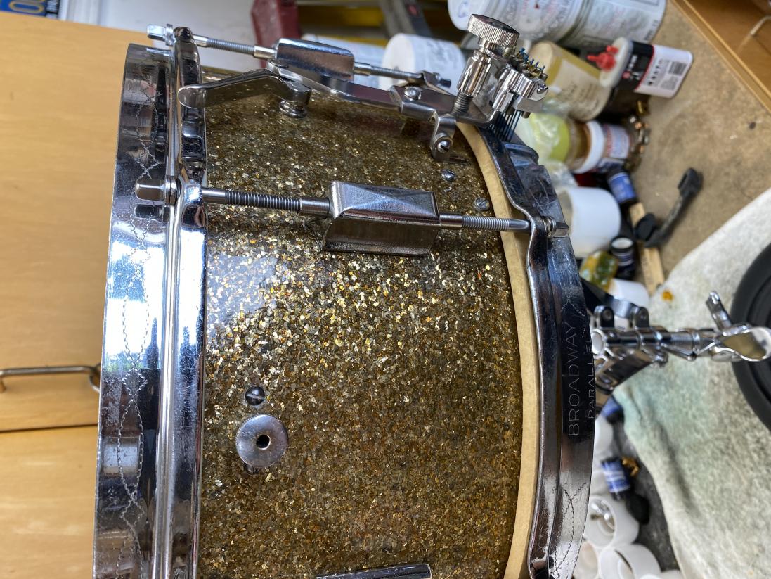There were a few gremlins that the previous owner neglected to tell Mark about. The worst was that the two strainer thumb wheels were forced on, cross-threaded and frozen in place. This is when you need a good machinist or friend. In this case my good friend Al Schneider (the original Drum Doctor est. 1963) came to the rescue. Al was able to re-tap the threads and brought the parallel mechanism back to life. The snares are Bill Wanser (Olympic Drums & Percussion) reproductions. If you need Leedy Broadway Parallel or Ludwig Super reproduction snares Bill is the guy for this. The rest of the chrome hardware cleaned up and polished up nicely. Top and bottom vintage calf heads rounded out this cleaning/restoration.