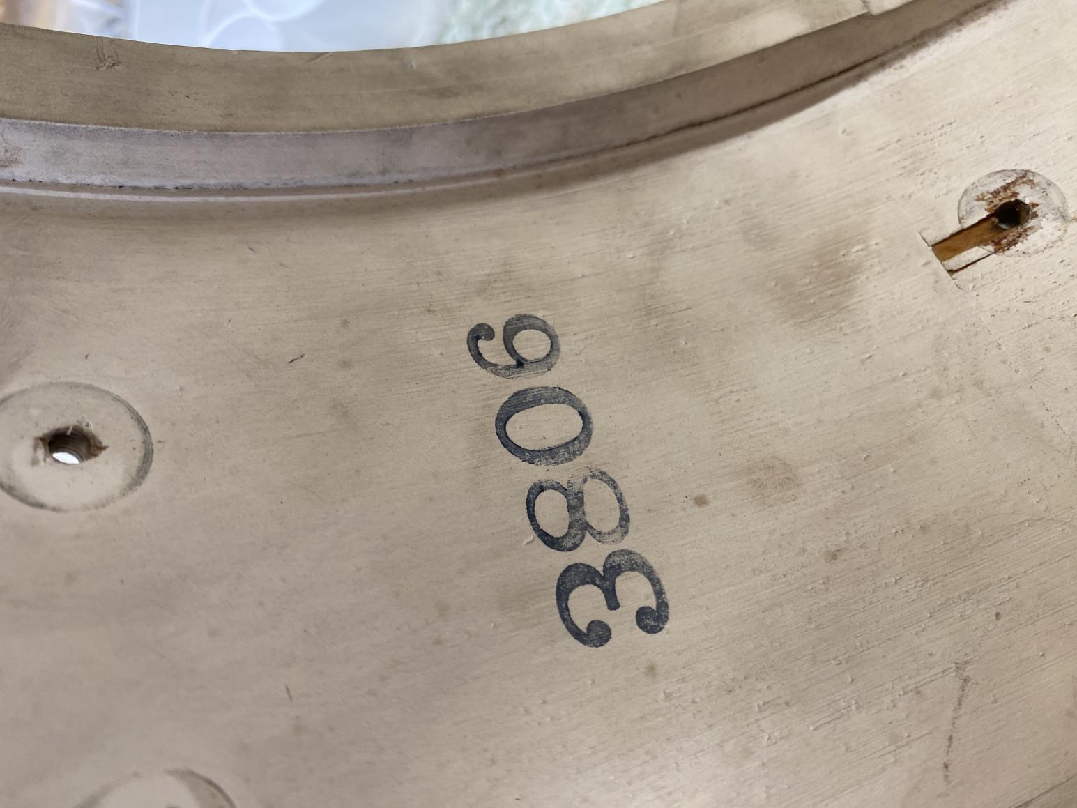 The solid maple shell is all good with no extra holes. The Gold Sparkle wrap is in great shape with none of the usual “black cancer” spots that we see on some older sparkles. The white interior is clean with normal aging. The 3806 date stamp is very clean and the badge grommet is tight.
