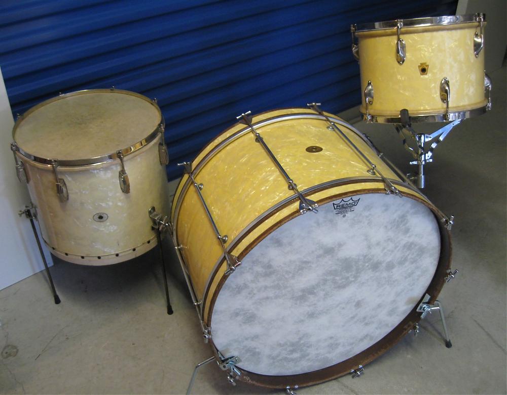 I picked it up about 3 years ago on an eBay deal. Drum was so big it had to ship Greyhound bus! All original except for one bass drum claw & T (and the Gibraltar hoop-mount spurs).Here's a better pic of it
