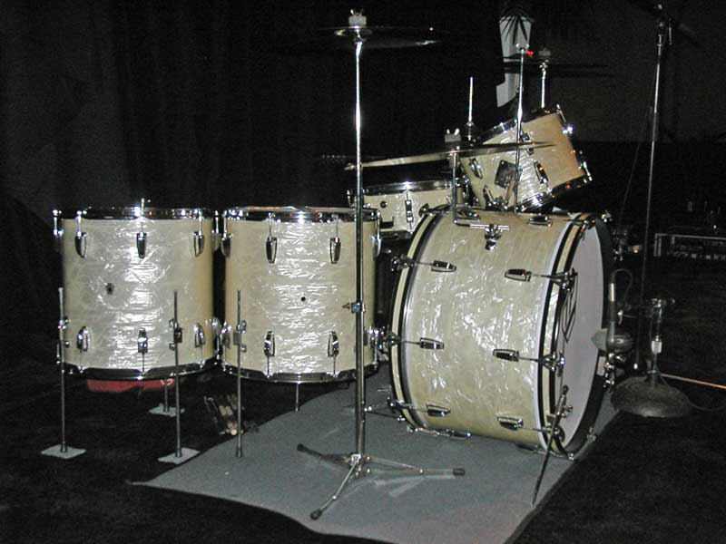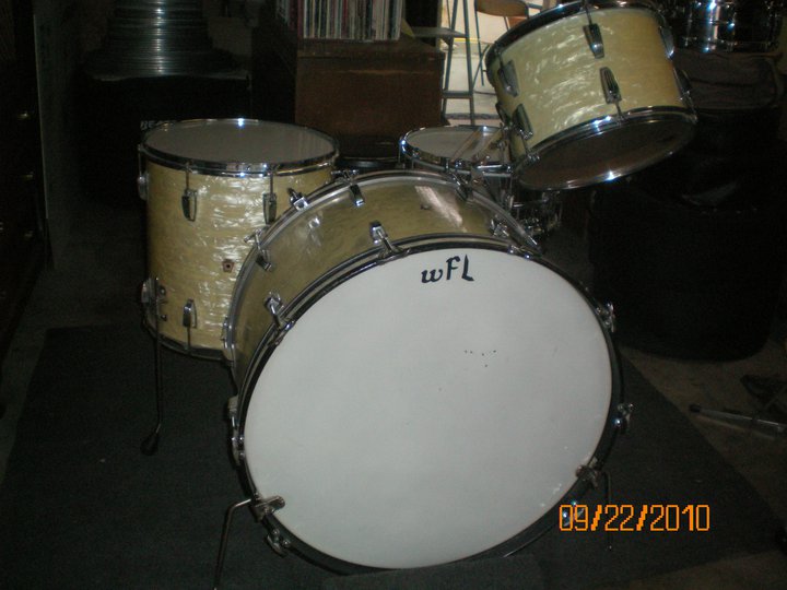 Ok...so i lied about promising to not ever again buy/trade/sell vintage drums in this life time or any other...but this was a good reason...listen up now my fine-fellow-vintage-drum-junkies...7-10 years ago,i was...YOU GUESSED IT...BUYIN/TRADIN/SELLIN...VINTAGE DRUMS and im my travels i managed to come across a very nice WHITE MARINE PEARL kit w/a 26" kick,13'tom-tom,and 16" floor (w/no bearing edges) Adorning keystone WFL badges! And upon looking in the great Rob Cook Ludwig Book,i was suprised to find that looking in the "outfits" section this is infact a 1947-1949 Buddy Rich configuration/kit!!! Like most of my kits in the past/present/future i try to never get attached and needed bucks quick for...you guessed it...ANOTHER VINTAGE DRUMSET!!! So off these went to a good trusted drummer buddy(who i knew would never play them and worships my opinion:p)...With the promise that if he ever needs/wants to sell these beauties, he would CALL ME FIRST...so i waited...and waited...AND WAITED...and had plenty of sellers remorse as the years crept by knowing these drums where gaining popularity and monitary value...FINALLY...in our current California rescession...he called out of desperation,needing money,so...i took pitty on him...and ...traded him:p (what a pal i am,right,but he did get my bonham kitClapping Happy2) What Karma right...THEN...just a week later...in the local CL adds...for only $100...a matching wmp buddy rich snare!!! THE DRUM GODS STRIKE AGAIN!!! Who says confession after 20 years of touring dosent pay offLaughing H!!!