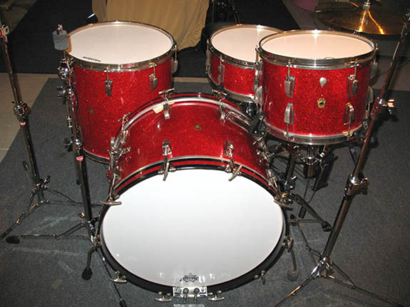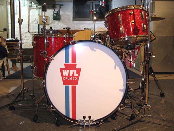 My wife is a PhotoShop genius and has designed a couple of bass drum heads for me. The general idea for WFL head below was taken from a design she made for me a couple of months ago for a B/O badge kit. She tried to match the red as best she could to the kit; the blue came from a hi res sample of her Lake Placid Blue Telecaster. The .psd of the WFL Keystone logo was sent to me by member over at DFO. The head was printed by DrumArt.com.