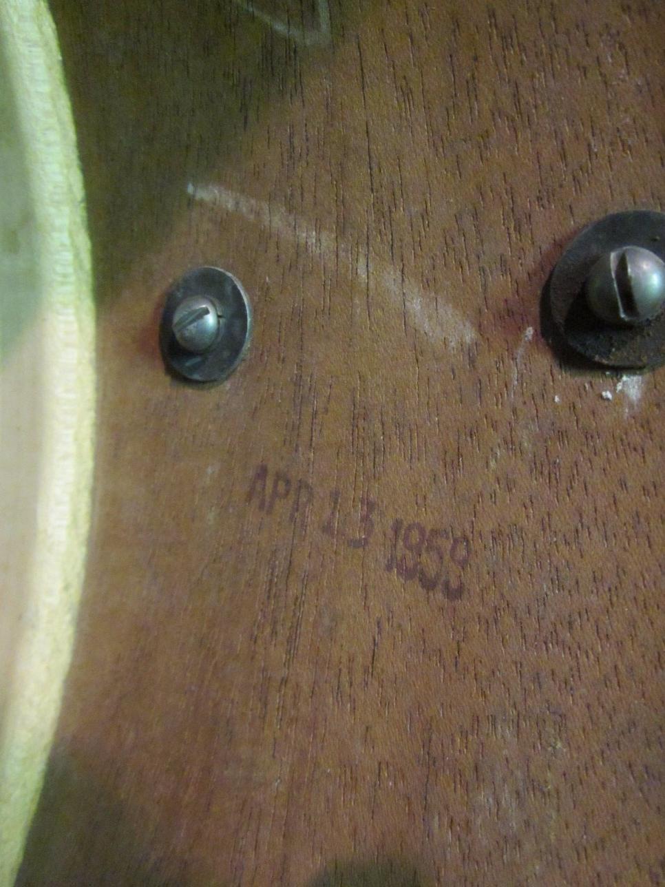 I recently won an eBay auction for a 1958 or 1959 Ludwig trans-badge 6.5x14 with 8 bowtie lugs, and an early-style P-83 strainer. I believe everything is factory-original, except for the black paint someone used on the tension rods and strainer. The black "pearl" wrap is original - why anyone would have paid extra in 1958 for boring black wrap is a mystery. The drum came with the original plastic-end wires but they were bent up beyond playability. Edges look "factory" and are unmolested. Snare beds were cut rather deep. Date stamp is April 13, 1958 or 1959 - not sure if the last digit is a mis-formed 9.