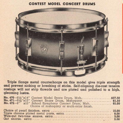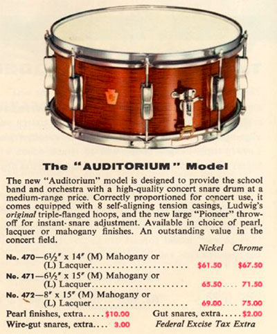 I'm not sure if this is a Contest or Auditorium Model. The 1957 catalog shows the Contest model as a similar drum with a strainer that looks similar to a P-83 but isn't. The 1960 catalog show the Auditorium model with a "large Pioneer" strainer. I can't find any 1959 catalogs so I don't know exactly what I have. Does anyone have a good answer on what this drum was called in 1958-1959?