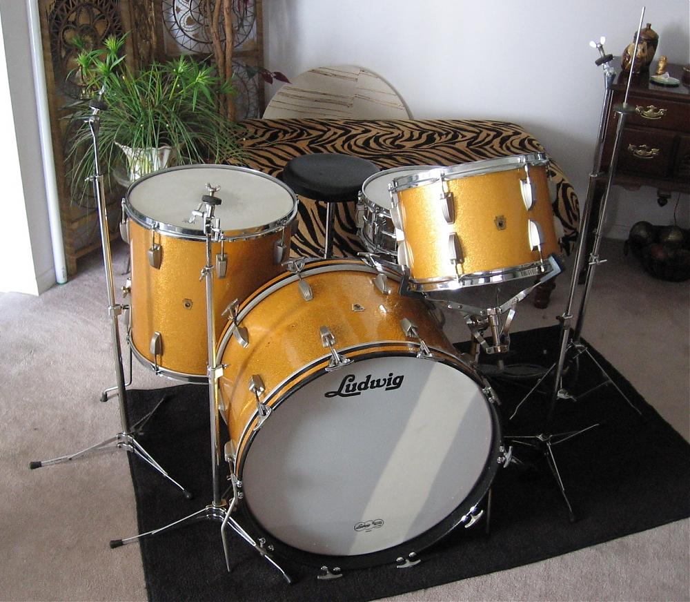 Nice kit, man. I also have a '58 Ludwig kit which I restored a couple of years back. It was raped...I mean re-wrapped in the 70's and a double tom mount added, but I brought her back to glory and she is my favorite drum set. I love the original gold sparkle wrap on your kit and you can't beat those natural mahogany interiors! I went with blue sparkle.