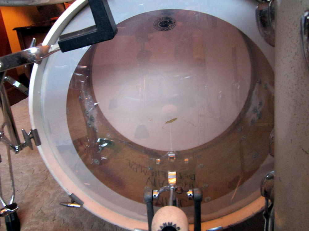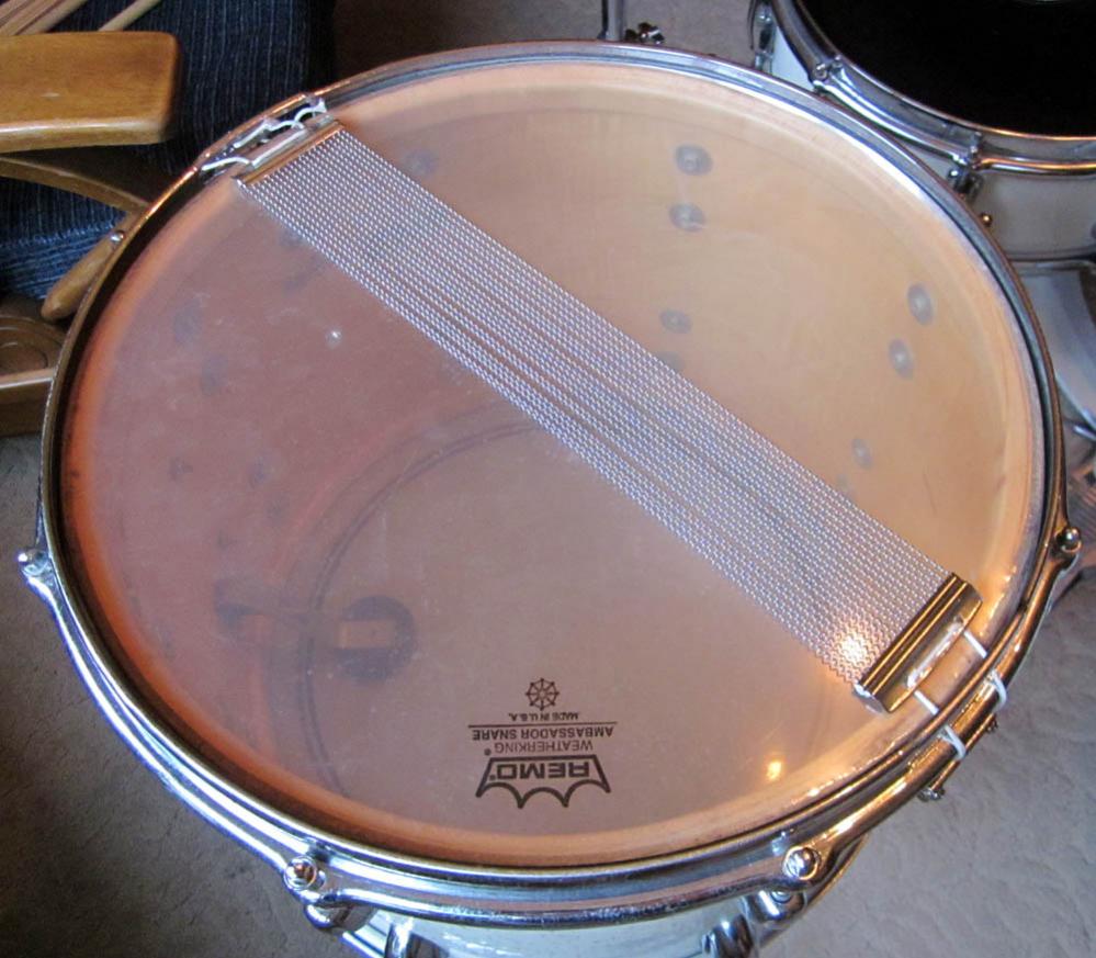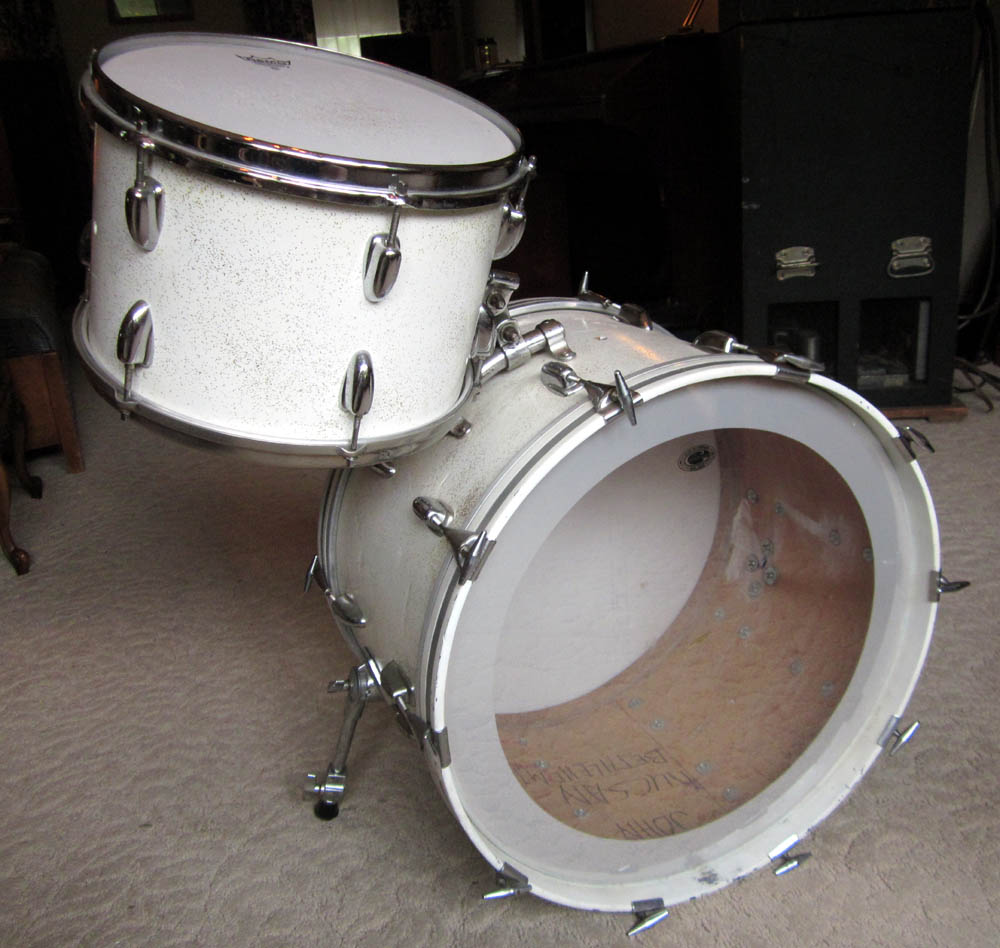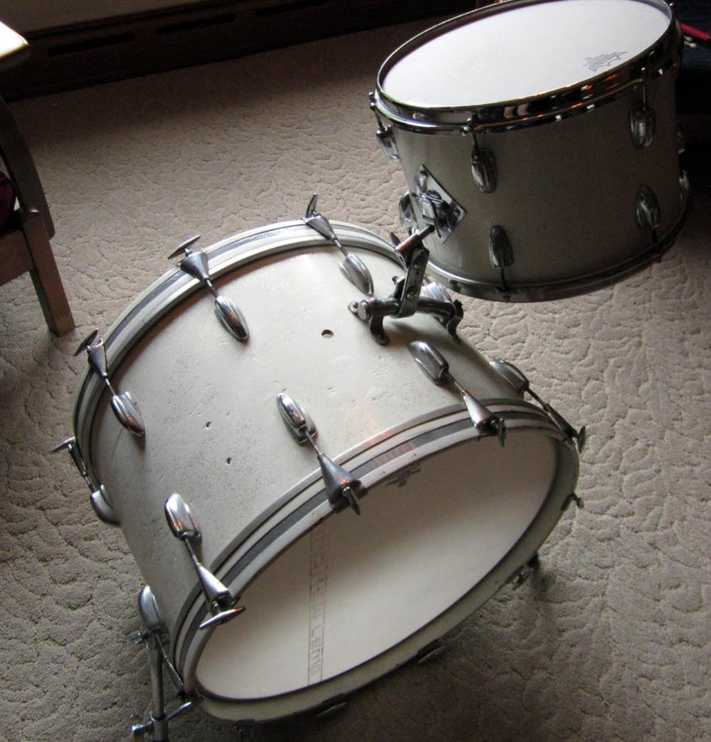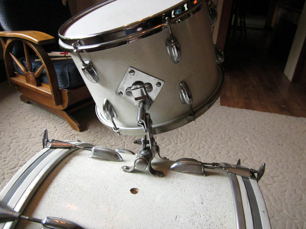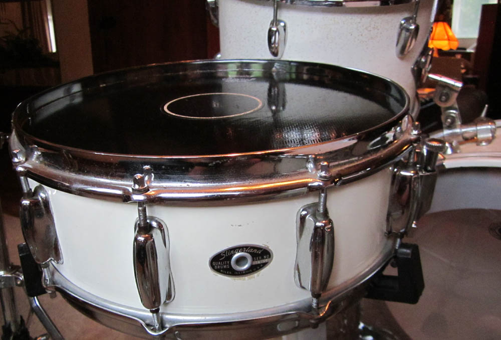 I also have a vintage COA Slingerland snare to go with it. It has a Falams head with an active snare system on it. Actually sounds really good. The drum was wrapped in white. Yes, someone wrapped a steel shell. Unusual, but it works and sounds great with this kit. There's more info on it in this thread: http://www.vintagedrumforum.com/showthread.php?t=44544