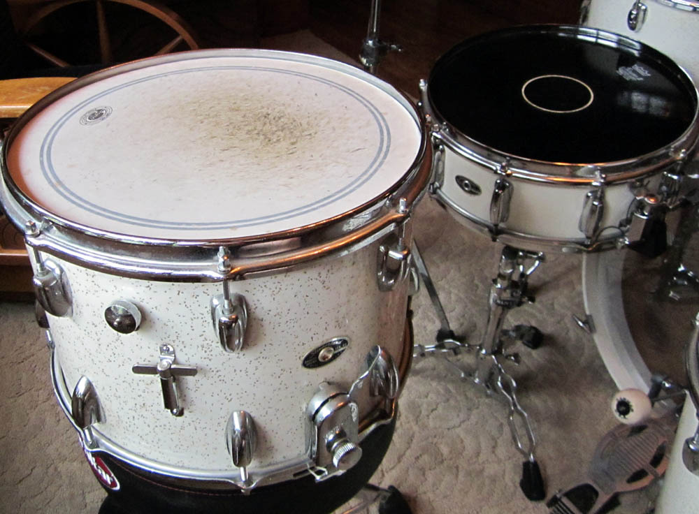 However, at some time before I bought them, the wrap must have deteriorated on all but the snare drum. So, someone decided to paint them white and put in gold flake to match the snare. So, they're not perfect from a cosmetic standpoint, but from a distance they're quite acceptable, and sound just as good as they should.