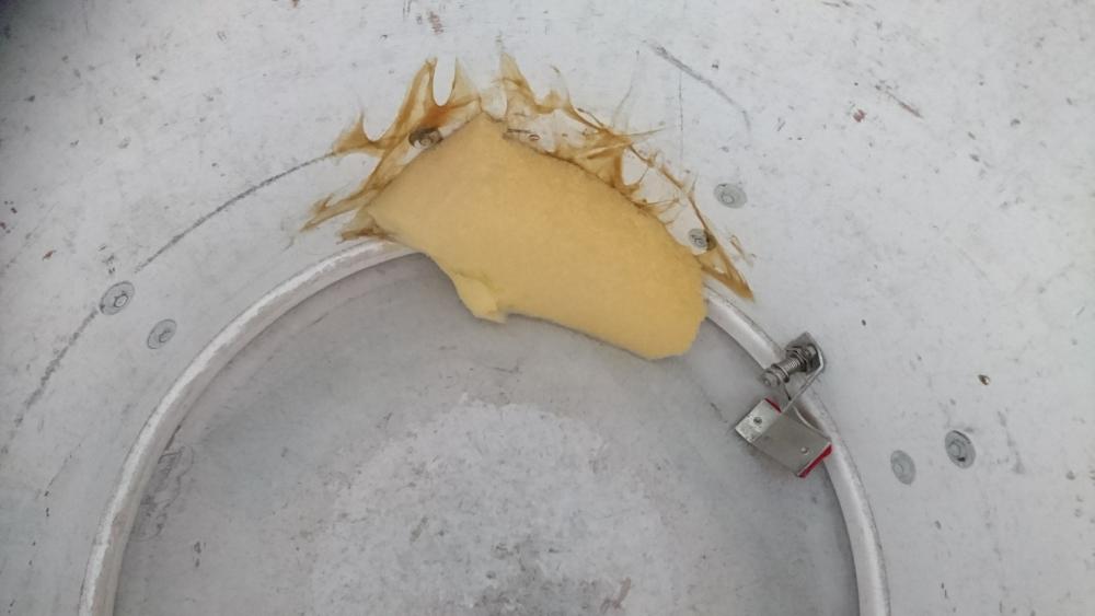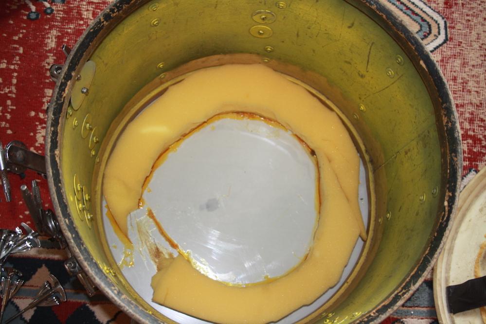 And there is a 16" floor tom as well. This is a nice one: the foam has been glued not to the head but rather directly to the shell (so you don't have to replace it when changing heads, I guess). Foam came off - glue stayed on.