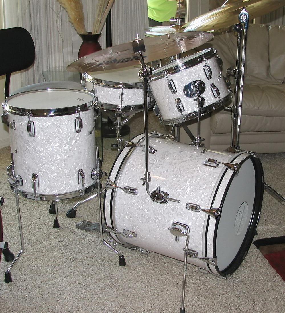 Also obviously a re-wrap since the white pearl (I hesitate to call it marine, since white marine pearl has a slightly blue tint to it and is a different pattern to boot) is too white and the pattern is much smaller than Rogers would have offered in the sixties. Obviously the "bass" drum is a converted floor tom.