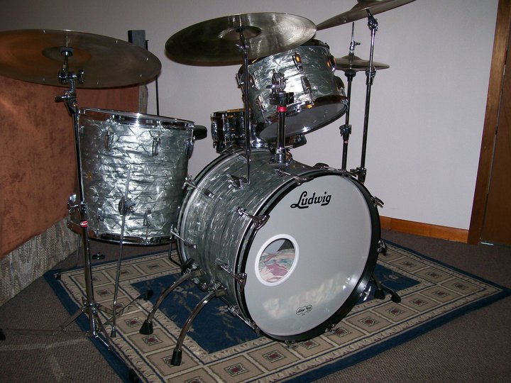 This 4pc. kit was purchased new in 1962 by my father. When he and mother were married in the early 70's the kit was sold to a cousin who added many toms and Hercules hardware. My parents bought the kit back and presented it to me last Christmas. My father and I worked to recreate as best we could his kit from the 60's. All drums were disassembled and polished before adding new Remo coated Powerstroke III heads. The original hardware including the consolette tom holder must have been sold years ago and finding replacements proved difficult. I decided to order new Gibralter "old school" flat based stands to compliment the kit. Since the bass had been drilled for a 70's double tom mount and dissapearing spurs, and filling holes and matching the finish would look worse in my opinion, I decided to order a new Ludwig single tom holder to fit the mount that was already there, as well as new spur mounts. We plugged the original comsolette holes with black plugs. The bass hoops were sanded and repainted. I still have Dad's original Speed-King pedal, but upgraded to a new DW3000 as I like the feel of it. The old sizzle ride and hi-hats were Dad's and our cousin added the two crashes later, all cymbals polished up and sound well together. Dad and I really have had fun with this project and look forward to playing them. I've always wanted a vintage kit and this one sounds and feels great.