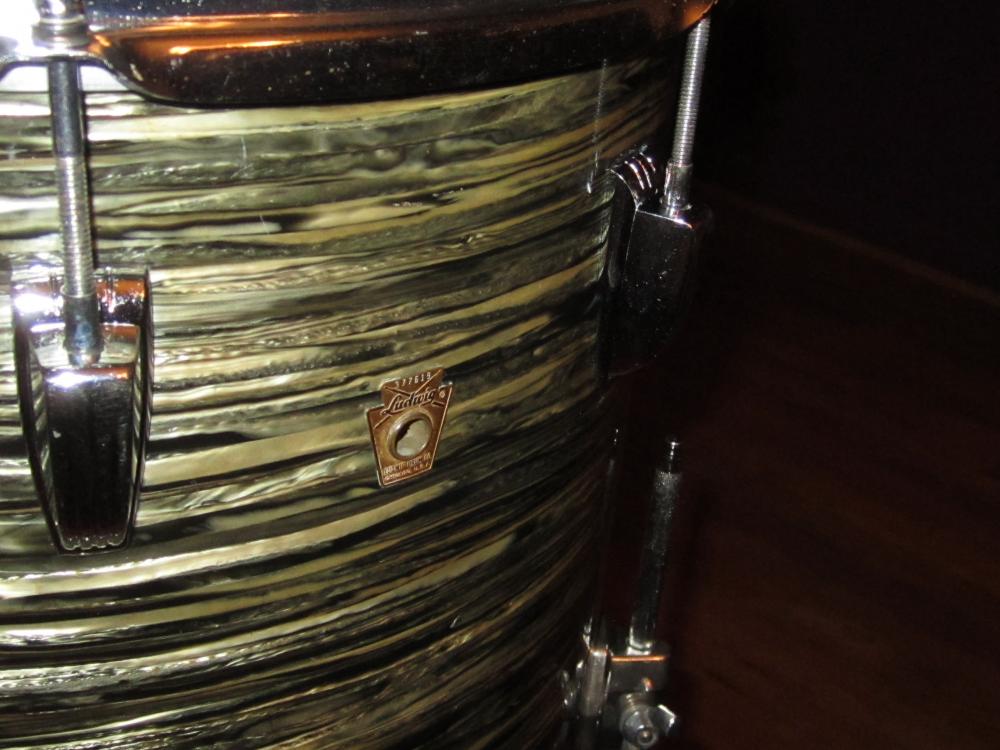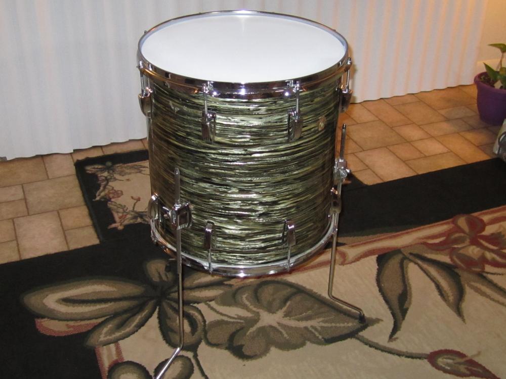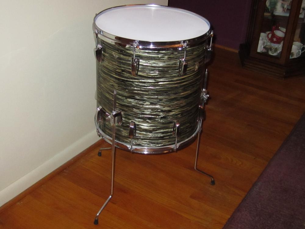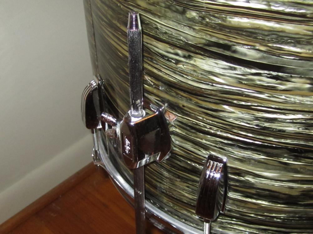 16X16 FT-you will have to look closely at the pictures as I have no clue how to gauge what’s important to a drummer when it comes to what is perhaps the holy grail of vintage drums. Every part appears to be original. Yes, 50 some years of use by middle schoolers have left its share of scuffs, scratches, dings and the like. I can’t apologize for those, but to my eyes, overall the drum looks awesome. I did manage to polish off most of the hormones. The seam is tight, the baseball bat tone control is complete, the bearing edges look factory issued and the legs appear to have the original rubber feet. The chromes do have a fair amount of pitting, but for a drum of this age, I’m not sure you could consider it excessive. Fortunately, because the wrap is “busy,” it hides the age marks pretty well. Look at the pic so you are aware of the fingertip-sized ding in the wrap that is most noticeable. As not to mess with the true vintage-ness of the drum, I only lightly polished the chromes with Noxon 7 and used Novus 1, once around, for the wrap as I’m sure the proud purchaser of this drum will want to give it his/her own level of detailing. I put generic white painted heads on simply to dress up the drum for sale and to keep the cost down. (Lawton Drum Company in Sunbury PA has period correct repro tri-circle Weather Masters for under $20 a piece, slightly more for bass heads). Since the purchase may be more like an investment, you may want all the info you can acquire, so you can certainly PM me for more details and pictures.