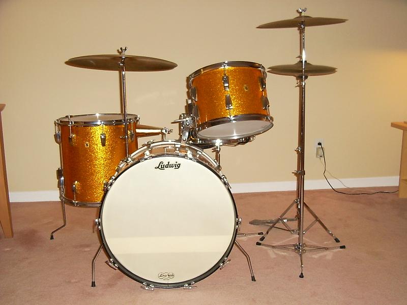 I just got these gold sparkles recently. They came equipped with a Ludwig cowbell, Speed King, 60's stands, pre-serial Paiste 602's, and the original Weather Master heads on the batters and resonant sides. Talk about luck!