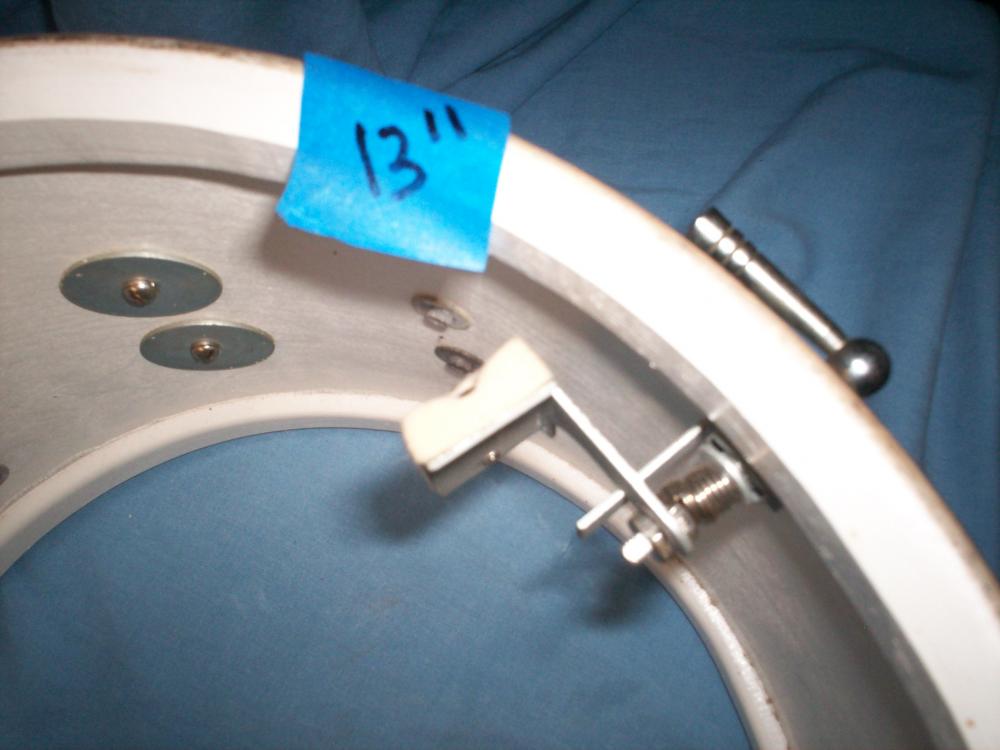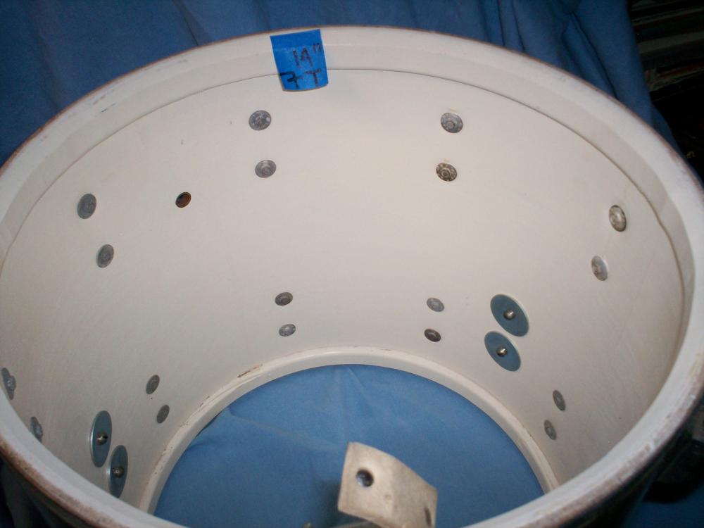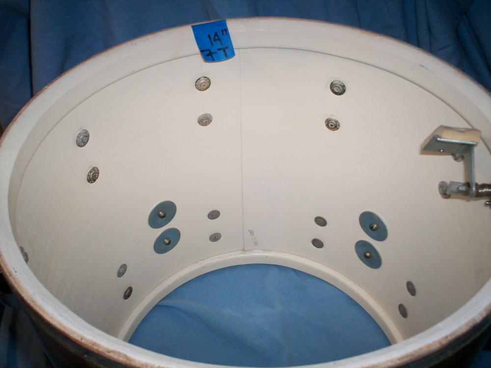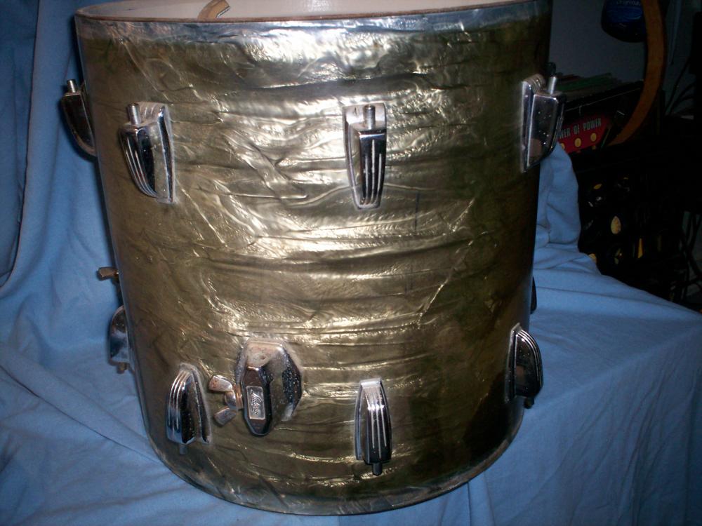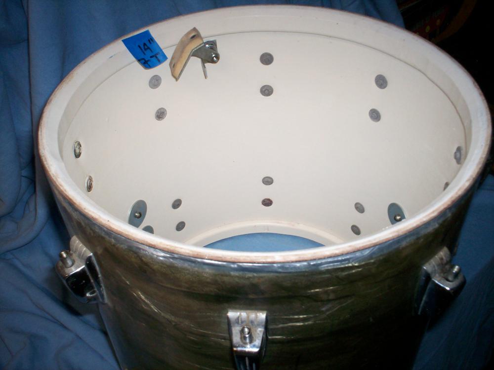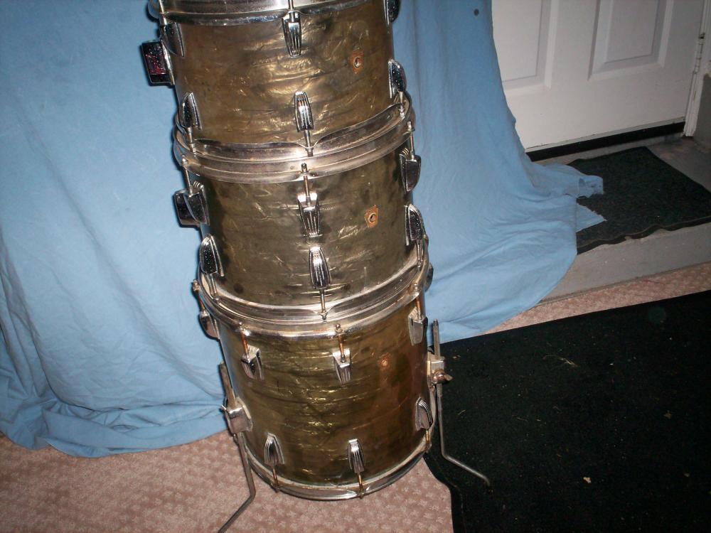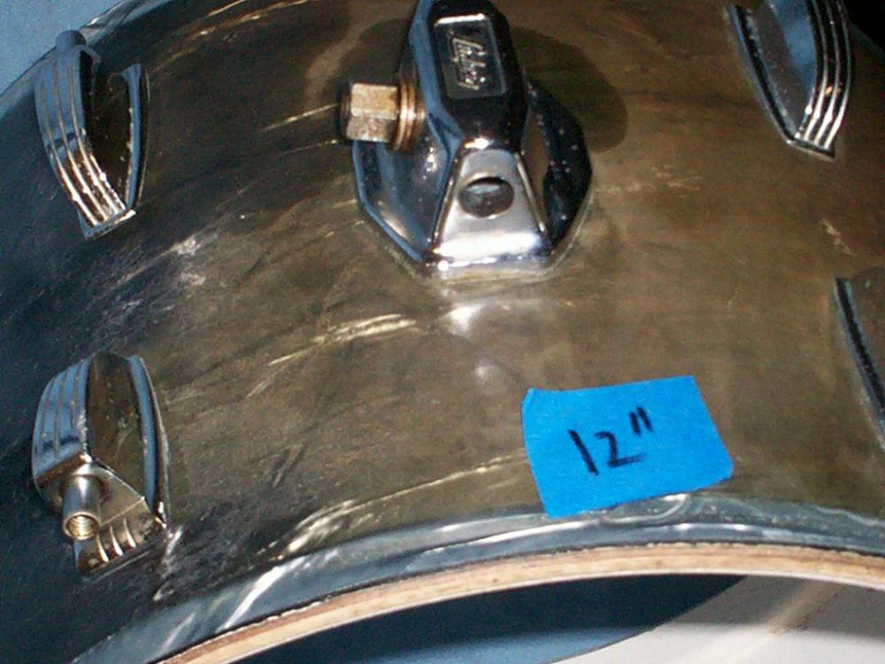 SOLD*****1968 Ludwig toms, REWRAP CANDIDATES, wrap in very rough condition. 8 x 12 tom,565xxx, date stamp Jan. 02, 1968, bearing edges are smooth but some waves in edge. FLAW; dime size crush mark under the muffler knob, goes thru one or two plies. 9 x 13 tom, 567xxx, no date stamp. 14 x 14 floor tom 564xxx, Jan 2 1968 date stamp. 3 legs, missing rubber tips. All drums are in round w/I 1/8", there is pitting on lugs, some rust on rims and tension rods and tom legs.