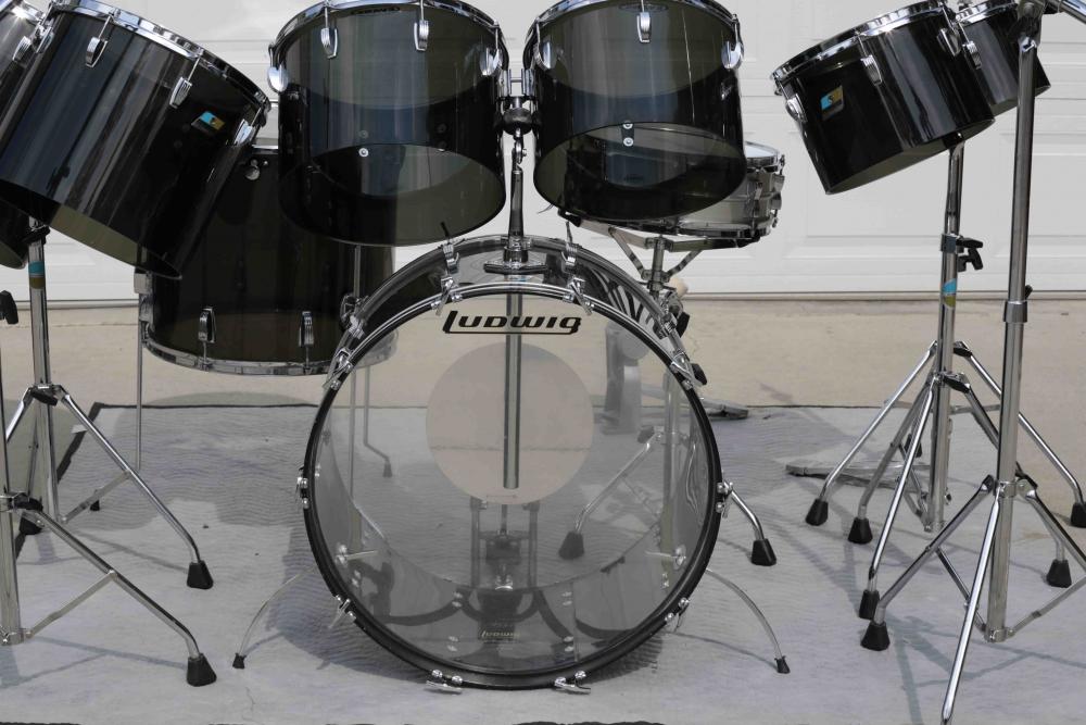 Many will say their drums are in "mint" shape when perhaps they are not. But honestly, these are 9.5/10. The only reason I say 9.5 because unless they are brand new, nothing deserves a 10. All serial numbers are sequential so this kit was bought as it is, minus the snare. He did not like the vistalite snare so is including another Ludwig snare. He is including all of the original hard cases which are in the same condition. Apparently this drum set has been housed and not used except for about two years when they were first bought. I do know the toms are concert toms so he has Evans hydraulics on the two middle toms and the floor tom. It also has a speedking pedal, identical to Bonham's setup. It has a 24" kick drum. If I buy and learn on this kit I will only make it a 5-piece. Way too many drums for a newbie like me!!