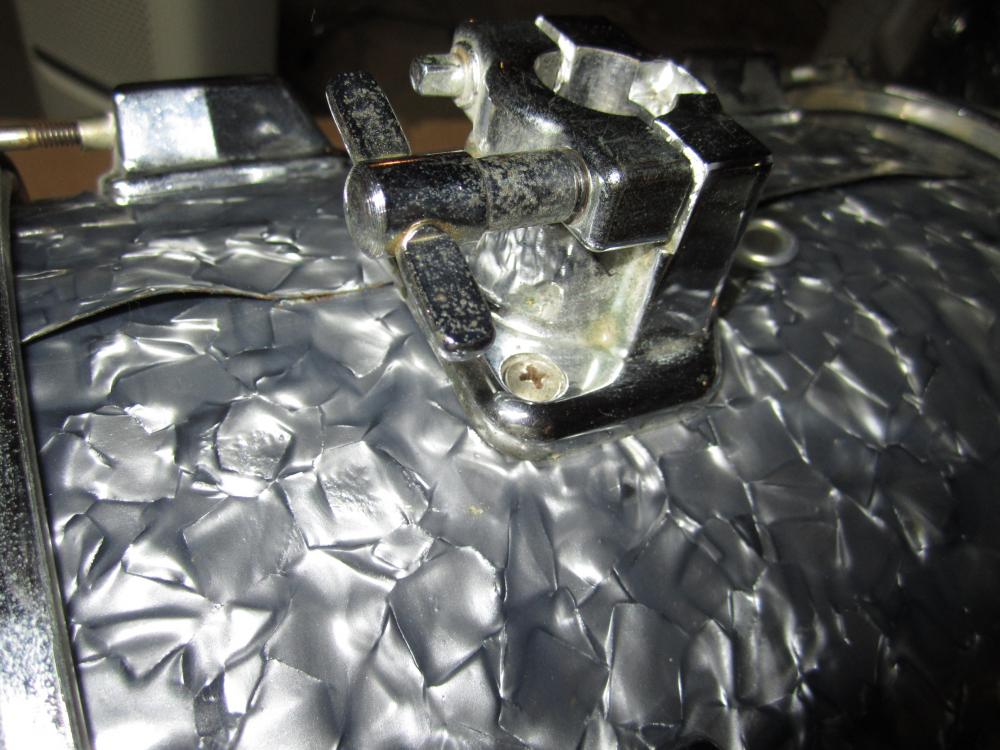 Then continue and repeat at each consecutive row of lugs. In this fashion, the wrap can be pulled tight against the shell between each row of lugs. At the last row of lugs, I applied another inch long stripe of adhesive between the layers of wrap and clamped it tight. The end of the wrap should lay under the lugs to help hide it - AND I'll repeat : plan ahead so that the overlap end is facing the drummer so that it is also hidden from viewing the drum from in front of the kit. Once the glue is set and fully cured, then bore out the last holes for the last row of lugs.