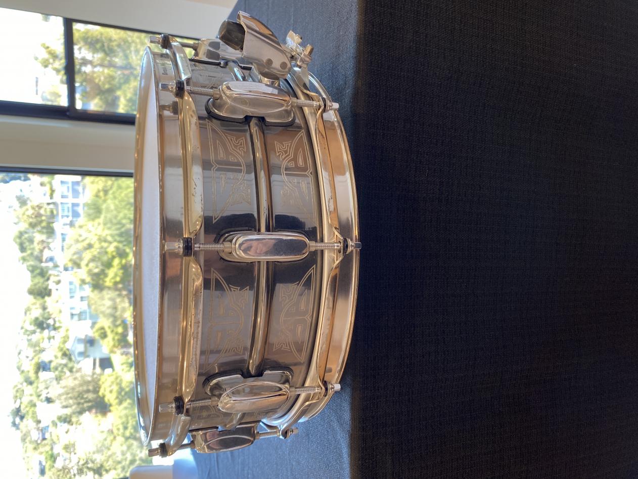 “This instrument is the same Kenny Aronoff Trackmaster Model as the previous one but in the 6.5 x 14 shell size. Only 30 of these snare drums were engraved/produced; this is #01 of 30 that were offered to the public. John Aldridge engraved these drums as well.”