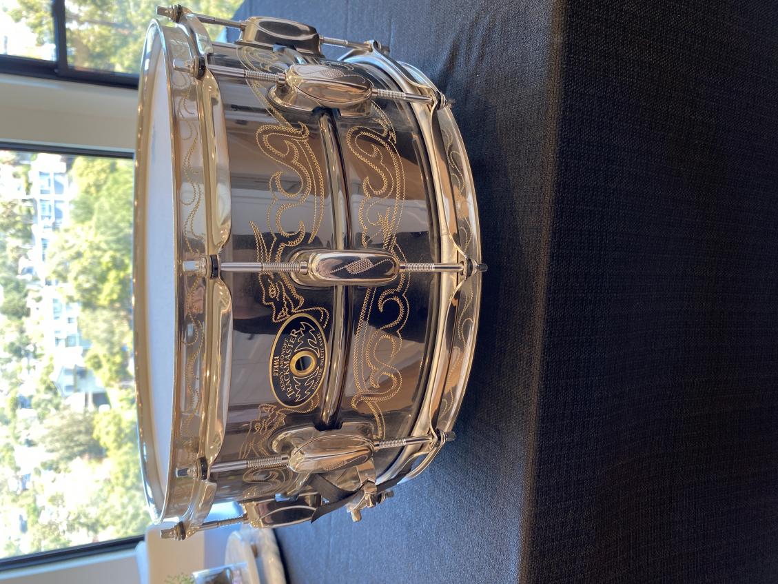 2001 5 x 14 10 lug Tama Kenny Aronoff Trackmaster Model: “The rejected prototype led first to a mass produced model with a hand-engraved shell, and eventually to this (5 x 14) Kenny Aronoff Trackmaster limited edition drum. Noted custom drum set artist John Douglas was commissioned to design a unique engraving pattern that would fit Kenny’s ideal. Thus the Twin Dragon pattern was created. Unlike the production models that had shells engraved in a much simpler pattern, Tama went all out on this model. Note the additional engraving on the lugs and rims. John Aldridge engraved all of the limited production drums. Only 42 of the 5 x 14s were produced and this drum is #32 of 42. There is a unique feature in the engraving pattern: the dragon’s head on the right is missing a nostril.”