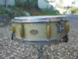Help! A friend of mine picked up a 5 x 14 Slingerland solid shell radio king in silver sparkle on the weekend for $40 Aus. with a bunch of old Olympic stuff. He passed the snare on to me! The lugs are painted with an artgold finish that looks factory to me, but I can't find any info that refers to these drums ever having artgold lugs as an option. The badge is the oval plain brass with the flourishes above and below the quality drums, so I guess around 1951. It also has a 3 point strainer and no snare cradle.