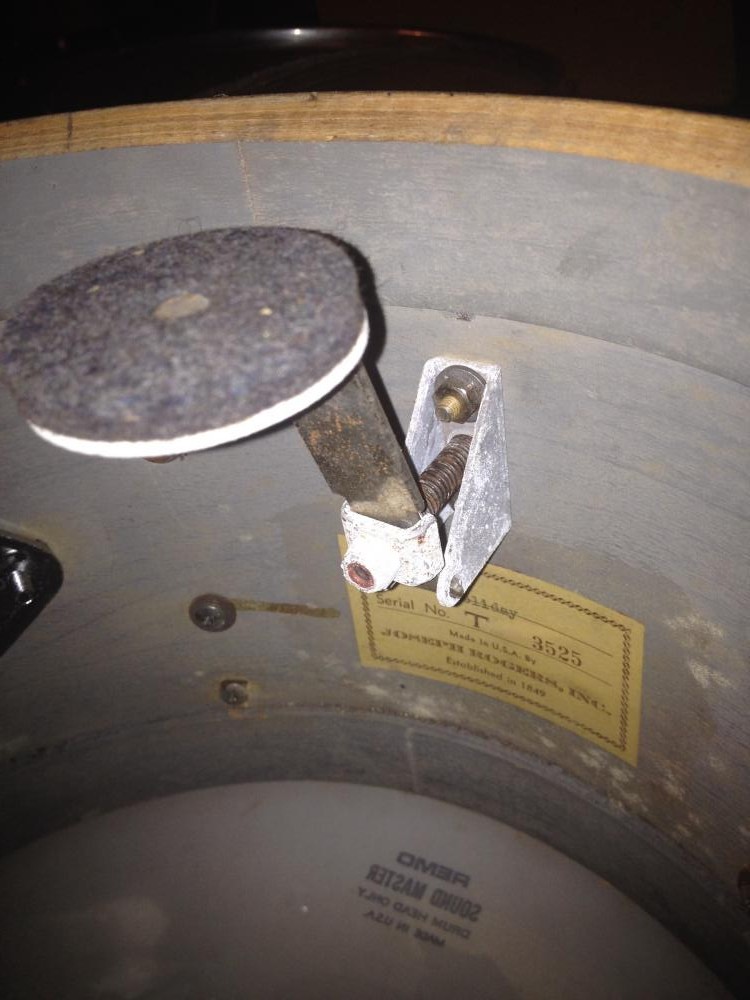 Now as far as the muffler or tone control goes, remove that mutant Ludwig contraption and find a Rogers tone control. Any Rogers tone control will fill the original holes and function fine, but one with a large flat, gray pad would be what this 1962-63 Luxor would have originally had...