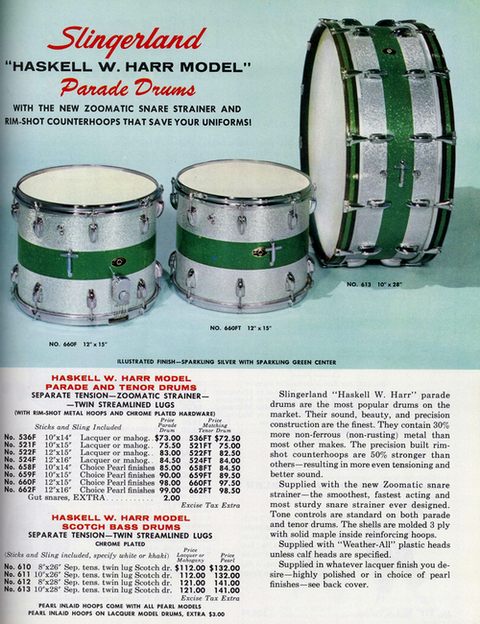 A fascinating piece ? depending on what the original factory hoops were this is either a Haskell Harr Model or a Contest Model marching tenor drum, made in 1963. The Harr is shown below. The only difference between the Harr and Contest was the hoops ? Harr had COB rim shots whereas the Contest had wood hoops and claws, like the bass drum shown in the picture. Other than the non-Slingerland hoops on your drum everything looks fine. As Rich points out, drums over 16 inches in diameter got 2 seams. Yours are in the correct location for a 1963 marching tenor, and they appear nice, flat and normal.