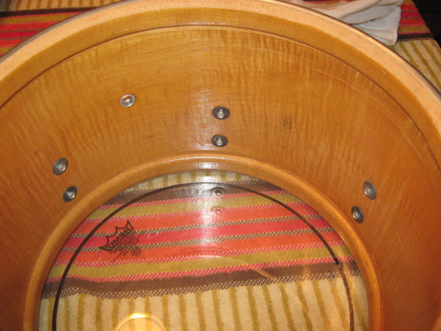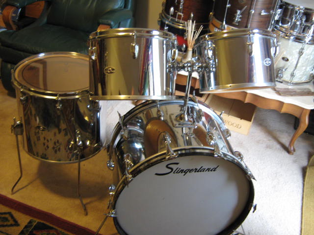 Like-new Remo pinners on the toms...... a Slingy logo on the front no-name bass head, and another no-namer on the bass batter.