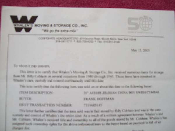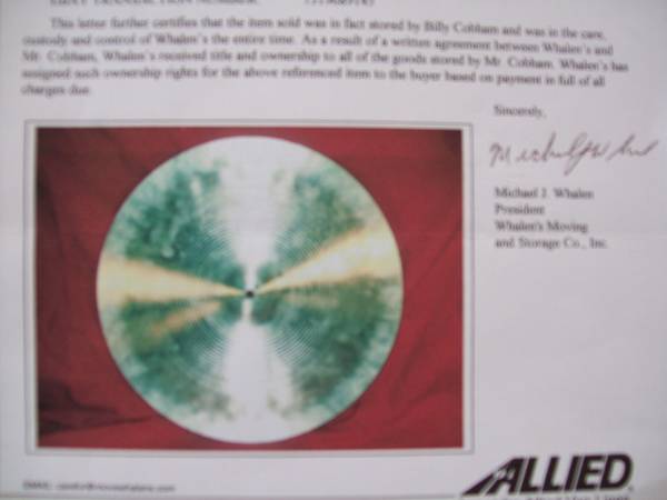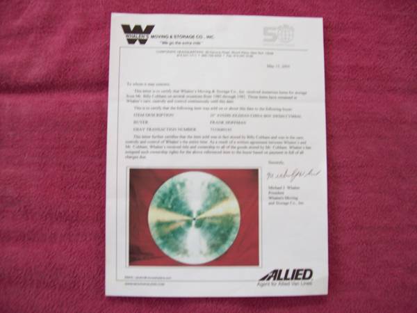 Now here's the back story on the cymbal. Along with the Swish came a signed document from the Storage places owner stating it with some of Billy Cobhams gear was stored from 1980-1985 timeframe until the 2005. At which point Billy agreed to sign over ownership of this and other items to pay storage fees and whatnot. So kind of a interesting history. I was able to verify the cymbal I have is the exact cymbal pictured in the document. This much I do know.