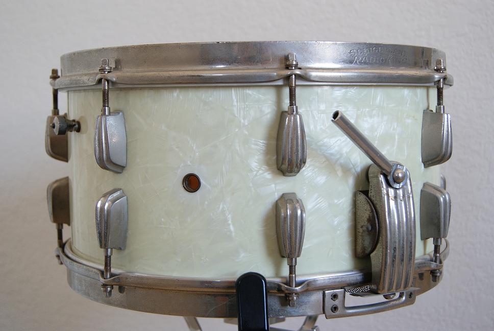I picked up this Radio King snare at a yard sale for $50...they didn't know what they had. It needs a good cleaning and polishing and it lost its badge somewhere along the way, however, it's otherwise pretty solid! Anyway, I am trying to figure out it's age as best as I can. Based on old Slingerland catalog pages I've been viewing the best I can tell is it's a late 40's - mid 50's model. Anyone out there have a clue?