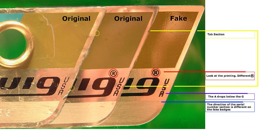 I'll post some pics to show you the differences. Look closely at the jaggady printing on the R and on the USA, as well as the orange peel look of the green and the brushed area extending to the edge.