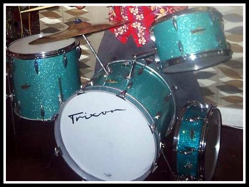 The drums are Deri-----from the early to mid-50's.The wrap colour is irrelevant. All companies had access to the same wraps and their offerings often overlapped, so despite the fact that the pictured Trixon drums are the same colour it is meaningless. ----kind of like thinking a Ford is a Chev because they are both cars and are the same colour. Mikey is correct about the arm. That is an old Trixon arm , you are picturing and those are rare too. There are many people with Trixon drums looking for those. The Germans probably invented the L-arm and since then, there has been a version of it applied to every mfg.'s drums. Unfortunately, each company had a different size, although there was sometimes equivalence. Trixon were the largest in Germany at 22mm( just a shade under 7/8"). Tromsa used 20mm ( .8 in.) Sonor had several sizes but the early ones were 19mm( almost dead on 3/4") Trowa/Tacton were odd at 23/32"---actually being an odd metric measure at 18.2mm. Deri, I don't know the size of but having seen some hybrid drums , such as Lindbergs, which seemed to be mostly Tromsa parts with some Deri parts----it looks like the Deri mounts may also be 20mm. Your best bet is to measure the hole accurately-----typically the hole is a mm or so larger than the arm and look out for an arm that will work, that is the next metric size smaller .If they do turn out to be 21mm or so , you can make a standard oriental 3/4" arm work by installing a thin sleeve inside the mount but it's ugly.