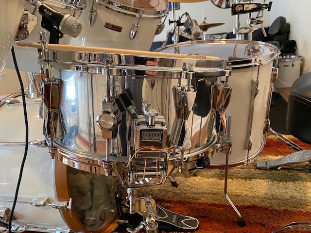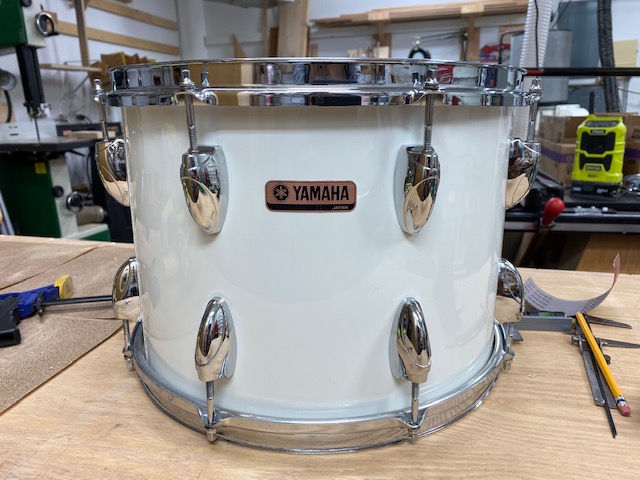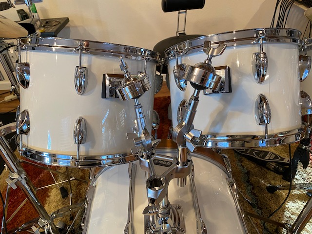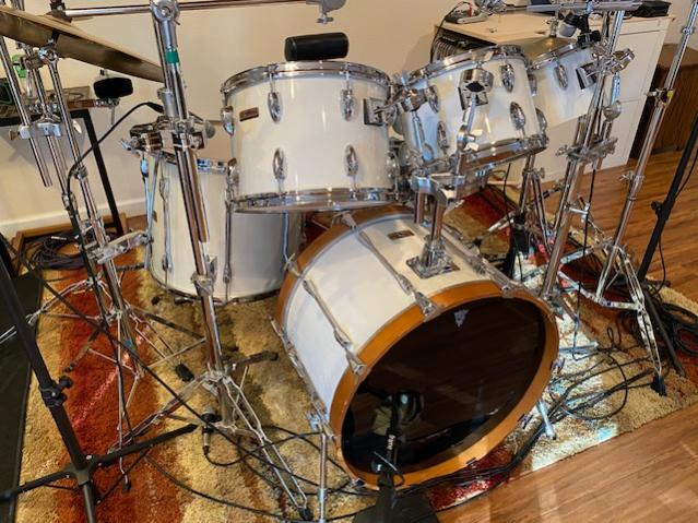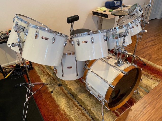 I acquired this set of 1982 Yamaha YD9000 (Precursor to the Recording Customs) drums about 1 month ago. I paid $900 for them, which included the nine Yamaha drums you see in the photos, plus a 6 1/2 x 14 Tama Granstar chrome-over-birchwood snare. The purchase also included a Zildjian 16" Projection Crash and a 22" Sabian Paragon ride, which is now my favorite ride cymbal. The drum sizes are 6, 8, 10, 12, 14, 15, 16, 18 floor and 22 bass. Only the floor tom and the bass drum have the double-ended long lugs we associate with Recording Customs. All of the other toms are single-headed concert toms. The set was in good condition overall, with only a bit of clean-up needed. No rust anywhere, and the little amount of tom rash is hardly visible.