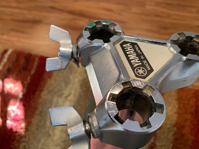 I should also mention that the Yamaha double-tom mounts were all in need of replacement. Each one had the nuts being pulled through the casing and not functioning well (see photo). Luckily, Yamaha still makes these with one small difference: They are made in China instead of Japan. Because they are concert toms, they have a different type of mount than typical Yamaha ones. They have blades, like Ludwig used for their concert toms, except the blade has a handy feature: two screws can adjust a plastic wedge to dial in a wobble- and rattle-free fit.