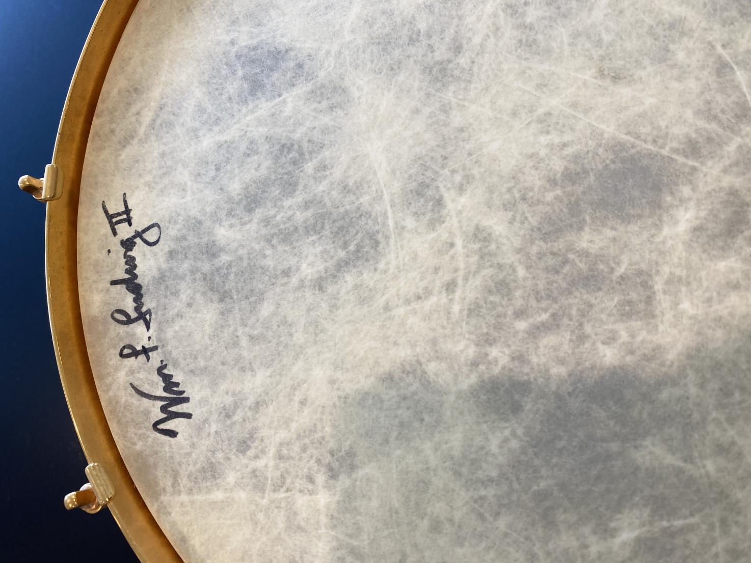 The entire drum is bright gold plated. L & L did offer gold plating as an option so this drum could be a special order or the drum may have been plated after market. If the shell was more of a satin gold finish then this would be an All Gold Model. The drum is all original and correct except for the top and bottom heads. A nice addition is the WF Ludwig II signature on the top head.