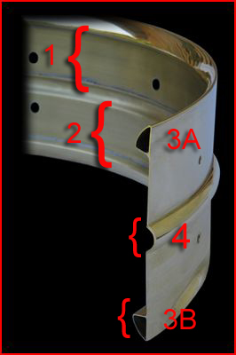 The method of construction is what really differentiates the early and modern BB's. The early ones were of two piece soldered construction (#1 = top shell, #2 = bottom shell, #4 bead - point where the shells overlap) and the bearing edges were formed and soldered into the shell (#3A & 3B). Modern shells are spun and the bearing edges are flanged (there was a flange illustration in a recent post). See the images below (images from AK Snares which I annotated)