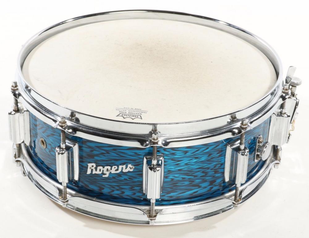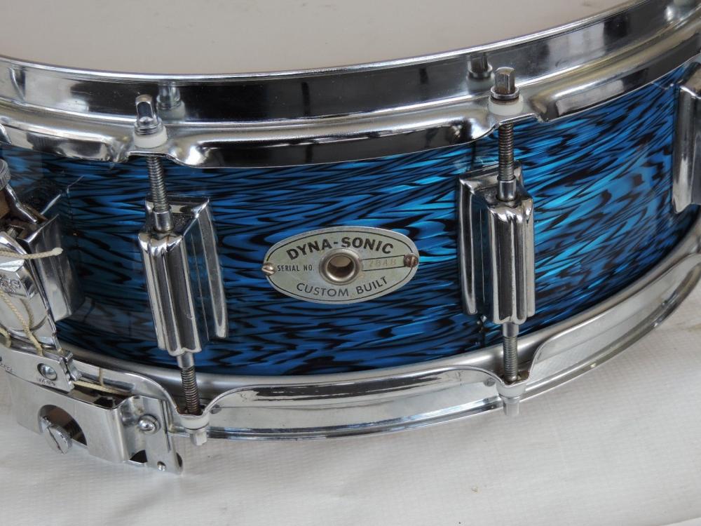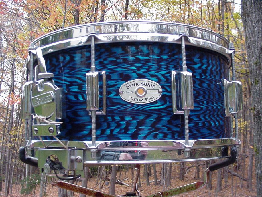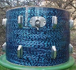 The auction has been ended and reissued without mentioning the questions. It also has a buy-it-now price of $1995. The seller no longer lists it as having "original" wrap. The wrap looks like one that was available much later than the Cleveland period. Attached are pictures of both the drum for sale and a 6-1/2 x 14 from the same era. The latter has a much more open pattern. I recall having a piece of wrap I got from Dave Drew back in the 90's that was like what you see on the drum that is for sale. It did not match any of the older blue onyx drum I had at that time. Also attached is a bass drum from the flat grey Dayton era.