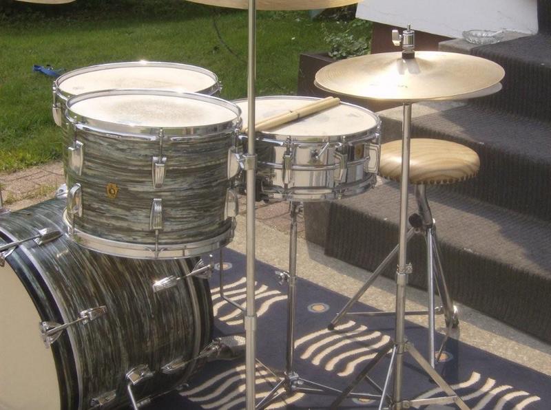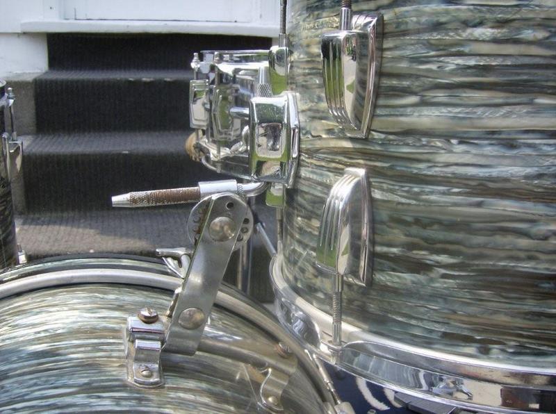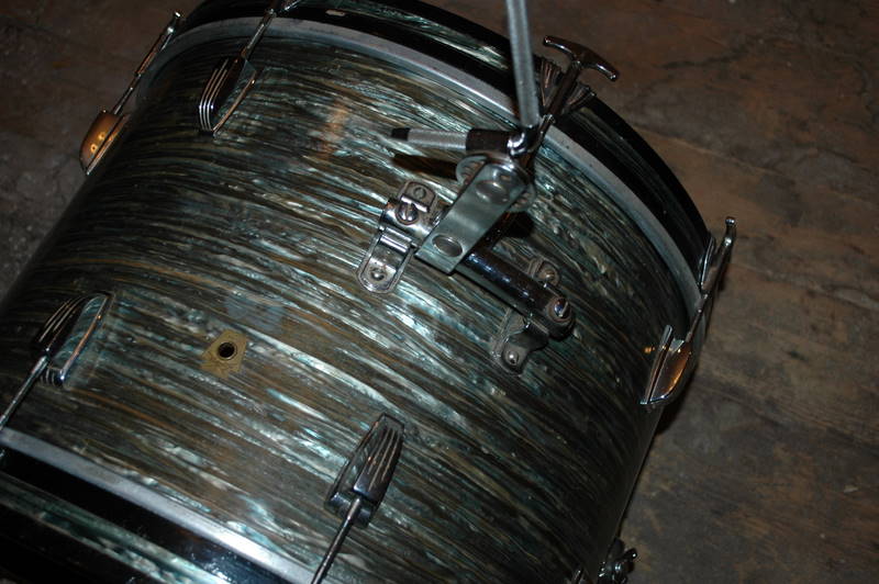 Here is my new kit. As far as I can tell it's a blue oyster kit(20/13/16 and Supra) that basically has a lot of green hues in the finish. I got these off the original owner who bought them off the floor sometime in 65-66? He played a lot of gigs and this man really cared about his gear and these drums. My first question is what makes a Ludwig Super Classic kit?-is it always the configuration of 22/13/16? Another thing I'm wondering is the serial numbers-this kit was bought as a set but the BD has no serial number on the tag-the 13" is 100898 and the FT is 143884. The snare is 304445 so obviously came later. Was it normal around the start of serial numbers to have a preserial tag I.E no numbers with a matched kit? All the interiors and wrap are aged identically and all have the BB bat mufflers however the tom has a square red felt and the FT is a square white felt. All the tom mounts and BD mounts are cast with the wing nut(no eye bolts) This appears to be a factory kit but would'nt the serial numbers be consecutive? I've included some pics. Any help would be appreciated on the serial number question and if the SKB came in different hues as this one almost appears green possibly due to aging?