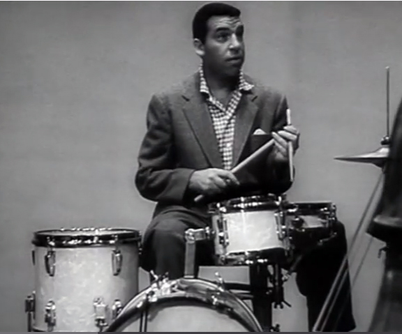 It's from Norman Ganz's 1950 documentary "Improvisation," which features footage from the Jazz at the Philharmonic concerts. Buddy's setup is noteworthy for its overall sparseness, with no ride cymbal at all, only hats. Of the drums the most unusual pieces have to be the rack tom--is that an 8" or 10"?--and piccolo snare. I'll attach a couple of cropped screen grabs that show the kit and the BR on the bass drum.