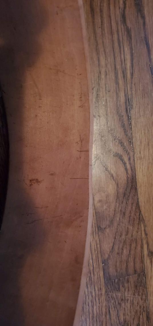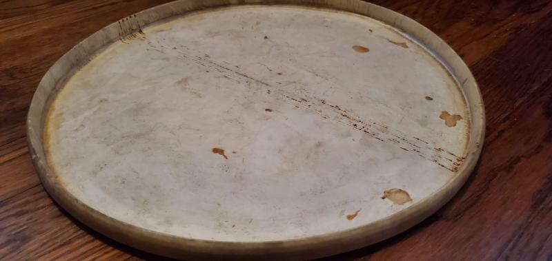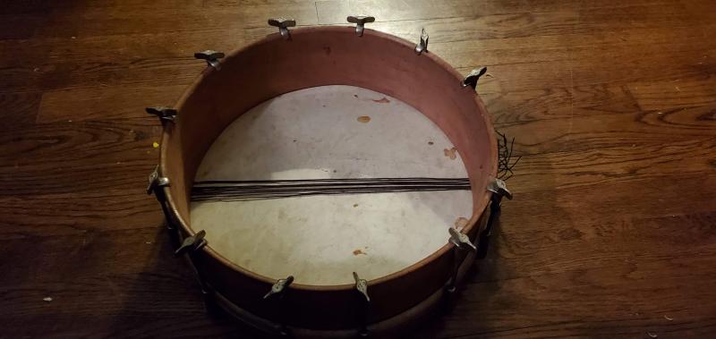 Obviously missing the bottom hoop and someone has mounted the head and snares incorrectly. The original bottom hoop would have a slight cut-out on either side to align the snares.
