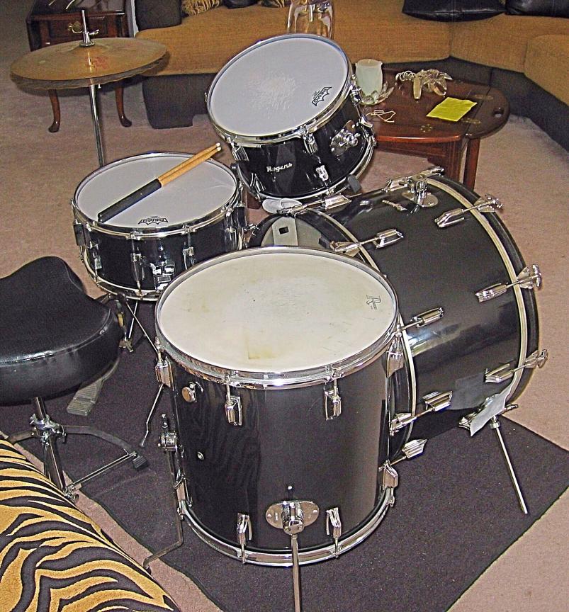 I got this Cannon snare drum thrown in on a recent deal. I didn't pay much attention to it until the other day. I had been looking for a black Acrolite for cheap to go with my 66 black Galaxy Ludwig bass drum I use with Ludwig silver sparkle toms. Then I realized it matched my Ebony Rogers set. It looks pretty old, has 10 lugs and 6 1/2"x14" and what looks like maple interior ply, maybe bass wood ? I can't tell but it is as nice wood as most of the inside of the majority of the snare drums at the local guitar center. I know these are supposedly cheap imports but I took it completely apart and cleaned it up and put a new Ambassador head and snare wires on it and it sounds pretty darn good, plus matches my Rogers kit. It sounds more like a steel shell than wood shell drum. I can't find this same drum anywhere when searching the net. Not one like it. I did find a similar 8 lug model in wood on a foreign ebay page. The only thing I can find are recent metal snares. I am going to use it on some gigs. Looks nice with my set too. Anyone know anything about this drum ?