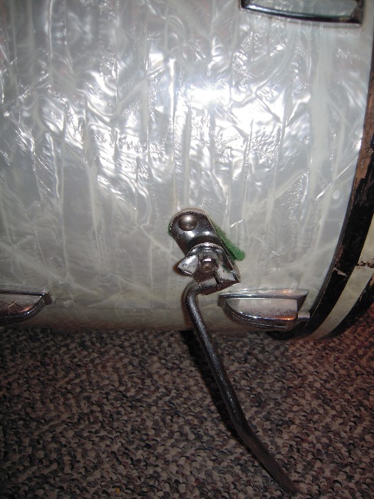 Heres the kick I got with the snare. I think its a early 60's Ludwig, but I may be full of it. It has no date stamp (60-63) and the badge has been removed, but you can still see the outline of it. Also not sure about the spur brackets.