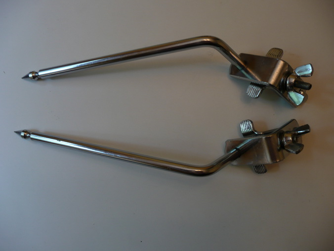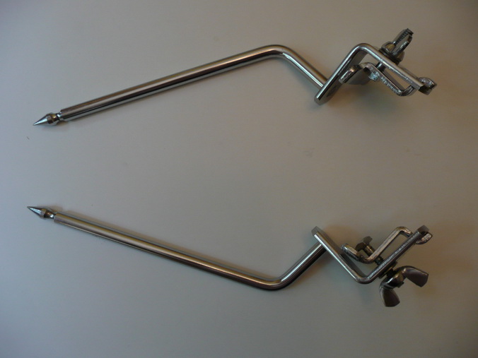 Hi - here's the photos of the Ludwig spurs. I'll be curious about your opinions as to their design. They seem incorrectly angled. Interestingly, the logos are similar style, but different size. On one of the photos, the spurs are clamped to the hoop of the '57 Ludwig 20" bass drum - this gives a view of the "wrong" angles. Now, conceivably I've mounted them incorrectly - that being said...