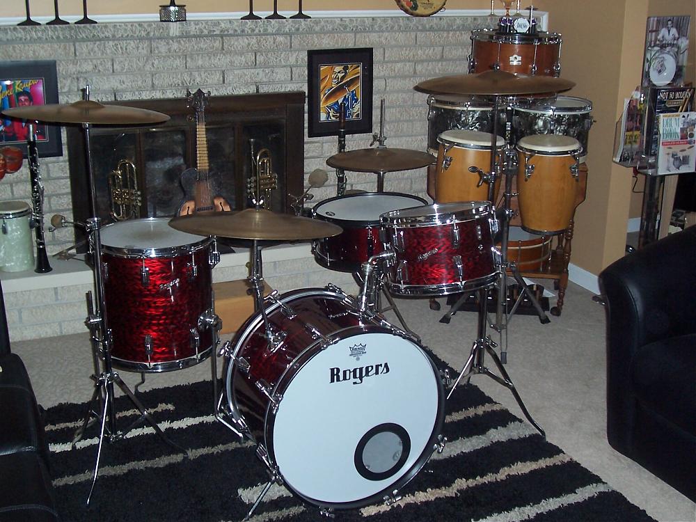After purchasing it I stripped all hardware, replaced any non-Rogers parts, polished it up, and touched up the bass drum hoops. The wrap on the bass drum itself was severely cracked, although the shell wasn't affected at all. I had the fine folks over at The Precision Drum Company wrap the drum in the matching Red Onyx finish. It matched my toms perfectly! The wraps on both toms are the originals.
