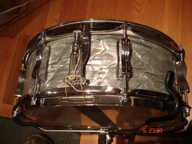 Back in June I came across this dirty old Ludwig Club Date or should I say Combo. I dont have a floor tom for it so I guess its a combo for now. The bass drum was missing the front claws, rods, hoop and head. I have finally found the parts and installed them. The hoop I bought is 1.5" tall by 21" dia. . The hoop that came with it was 1.75" tall and 20 5/8" diameter. I knew the new hoop was smaller in hieght but thought gee here is a hoop with bsp inlay, 20" diameter and whats the chance of finding that again! After putting it together I am a little dissapointed that the claws dont wrap around the hoop very good. Its obvious that I do not have the correct hoop but whats the chances on getting a sbp inlay hoop that is 1.75" by 20 5/8" ??? I think I will hold on to the new hoop and keep looking for it.
